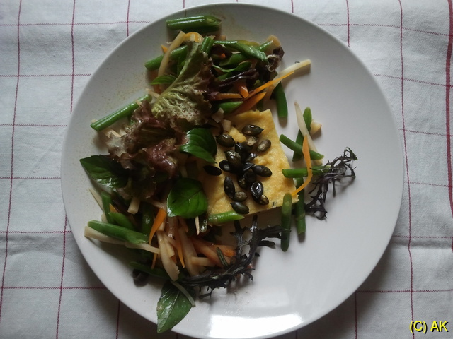 wasabi port, néhány kocka marinált temphét. Természetesen bármit bele