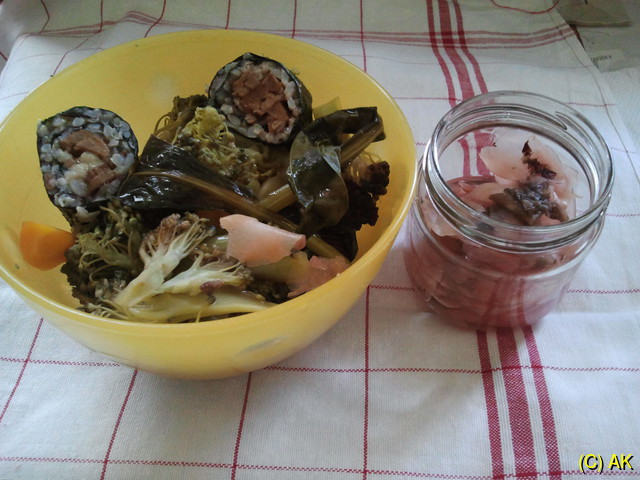 50g főtt barnarizs; 1db nori lap; 200g zöldségek: brokkoli rózsák, 1 kicsi sárgarépa (50g) 1 cm darabokban, 1 lila hagyma (50g) négybe vágva,