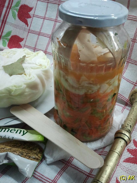 Kaptam egy 1 kg bio fehér káposztát és volt a hűtőben egy kevés megmaradt brokkoli. Recept: 1 kg késsel vágott káposzta (lehet géppel is), 1 marék brokkoli, kevés fűszer (egész kömény, babérlevél, fokhagyma, fekete bors), 2 csapott ev. tisztított só (2%), A káposztát a sóval néhány percig gyúrni kell, míg levet enged. Hagyjuk állni min. 20 percet letakarva. Az üvegbe belenyomkodjuk és a saját (!) levével elfedi még a "lenyomott" káposzta-kalapot is. Pluszként egy kis befőttes üveggel lenyomjuk és celofánnal rácsavarjuk a fedőt. Kezdetben a konyhapulton (kb. 1 hét), majd a kamrában tároljuk és összesen 5-6 hét múlva fogyasztjuk. Felbontás után hűtőben kell tartani. * 3. képen lilakáposzta, édeskömény, sárgarépa, gyömbér reszelt savanyúság, ez 1%-os sóval készült, mert nekünk a 2 százalékkal túl intenzív lett az íz;