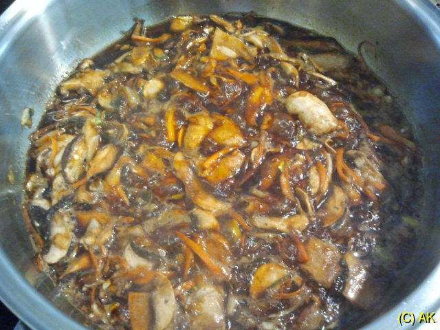 Recept: 5 fej erdei gomba (shiitake, csiperke, laska stb.) - vékonyan karikára, fél kk. fűszer keverék (őt fűszer, garam masala), 0,5 dl szójaszósz (GM és tartósítószer menteset válasszunk) vagy paradicsomlé, közepes hagyma - apró kockára, 1 tk gyömbér - apróra kockára, 1 ev. citrom leve, 1 kk. nádcukor vagy 1ev. szirup, A fentieket (gombás pác) összekeverjük és állni hagyjuk a hűtőben min. 20 percig. Közben felszeletelünk egy sárgarépát vagy egy kisebb kápia paprikát.