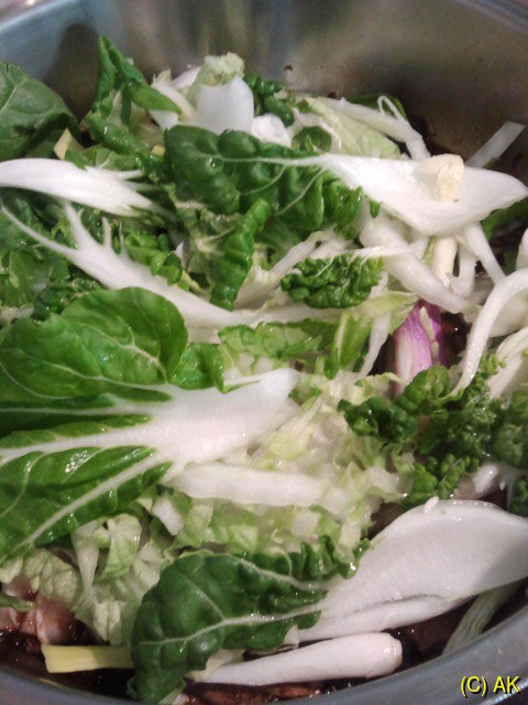 A kevés olajon vagy vízen kevergetve üvegesre pirítjuk a vöröshagymát, majd fedő alatt tovább főzzük 2-3 percig. Beletesszük a házi készítésű savanyú káposztát és az egy db szeletekre vágott shiitake gombát. Felöntjük tiszta vízzel a káposztát, hogy bőven ellepje. Ekkor tehetünk bele néhány gerezd fokhagymát is, ízlés szerint. Kuktában kis lángon 60 percig főzzük, majd kiengedve a gőzt levesszük a tetőt és belerakunk 1-2 evőkanál főtt babot és összemelegítjük. Tetejét meglocsoljuk 1 kk szezámolajjal. * a vöröshagyma mellé tehetünk egy kevés juliennre vágott sárgarépát, * a shiitake gombát áztatssuk 15 percig forró vízben és utánna szeleteljük fel vékonyra, a szárát dobjuk ki, * Tálalhatjuk tofutejföllel/kesutejföllel, de ez elhagyható. A tofutejfölhöz