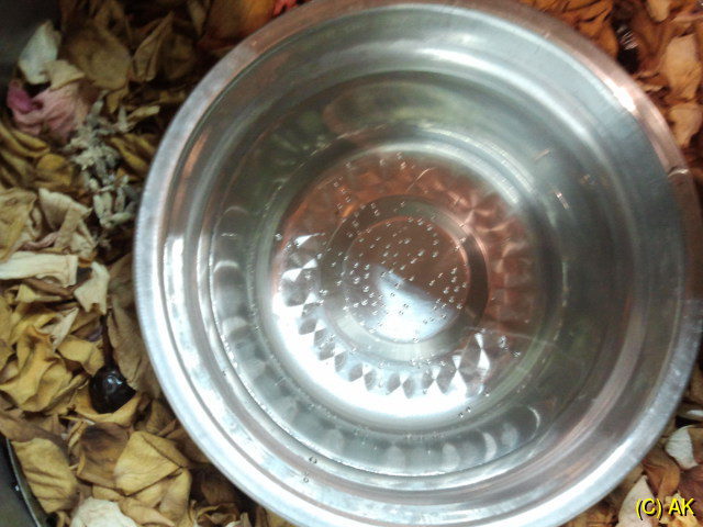 A fazékba helyezzük be a párolóbetétet. Öntsük fel annyi tisztított vízzel, hogy még a betétet ne érje el a víz. Középre helyezzük a rozsdamentes tálat, majd köré szórjuk a rózsaszirmokat. Tegyük tűzre az edényt és forraljuk fel bármilyen fedő alatt. Forrás után vegyük kis lángra, akár lángelosztót is tehetünk alá és a fedőt cseréljük le a 'jeges' tálra. Minél tovább tarjuk a gőzt, annál lassabban olvad a jég és több párlatot nyerhetünk. A saját fazekam esetében ez 40 percig is eltarthat. Ha a jég teljesen elolvadt, akkor zárjuk el a gázt! Hagyjuk hűlni a teljes berendezést, nehogy égési sérülést okozzon. Nálam a 6dl tisztított vízből és sok szárított sziromból 150ml rózsavíz szokott elkészülni.