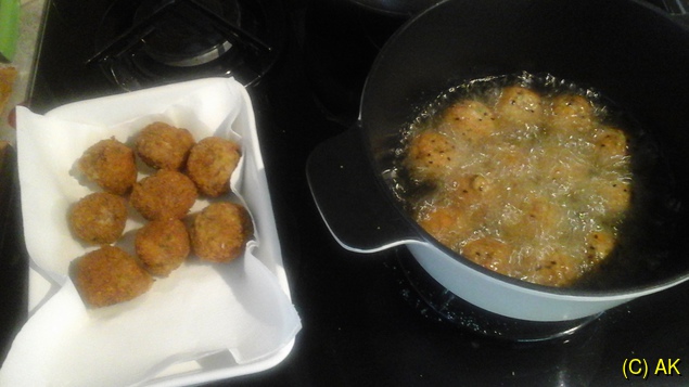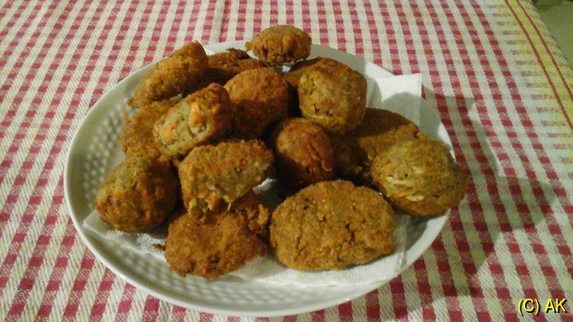 Újév első napján nálunk kihagyhatatlan a lencseleves. Így jó nagy fazékkal készítettem és maradt is bőven. A maradék levesből kiszedtem 'valamennyi' főtt zöldséget és lencsét, majd összemixeltem. Ízesítettem még frissen reszelt gyömbérlével és tamarival is. Kellett még hozzá felesbe hajdinaliszt és (pirított) kisszemű zabpely, mert ezeket folyamatosan adagolva-keverve tud összeállni az alap. A bio hidegensajtolt napraforgó olajat felmelegítettem és az első golyónál próbát csináltam, hogy szétesik-e a golyó. (ha szétmenne tegyünk még hozzá fokozatosan többször is kevés hajdinalisztet).