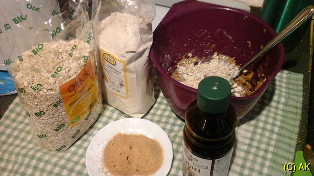 30 dkg liszt (20 dkg bio teljes kiörlésű tönköly ill. 10 dkg bio fehér tönköly simaliszt) két csipet só, 1 tk aluminiummentes bio sütőpor (vagy étkezési szódabikarbóna) 2 csipet fahéj; 1 ek hidegen sajtolt szezám olaj; 1 csé szódavíz-almalével keverve, almaléből kevesebb;